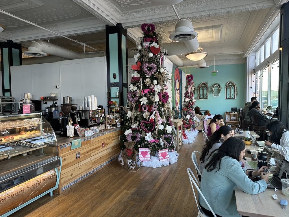 The atmosphere here strikes a perfect balance between cozy and lively, adorned with local artwork and unique décor that tells stories of culture and creativity. The striking Frida Kahlo mural adds character, while plants for sale give the space an inviting freshness. Customers often rave about the delicious pastries, especially the jalapeño brioche and ham-and-cheese croissant, which have become local favorites.